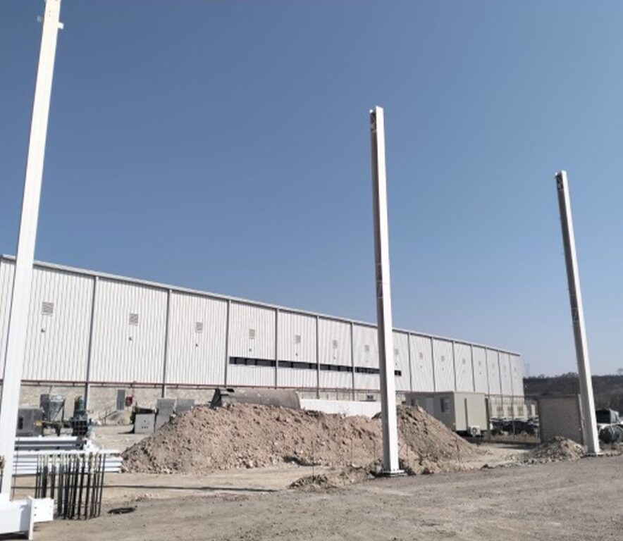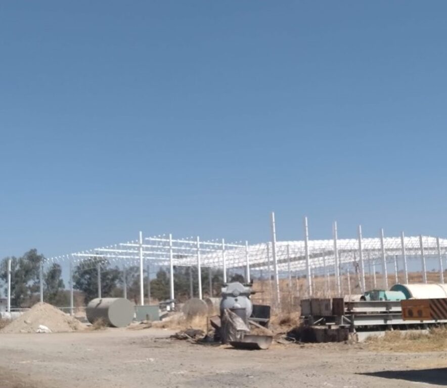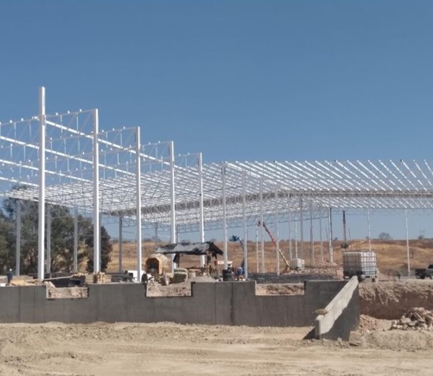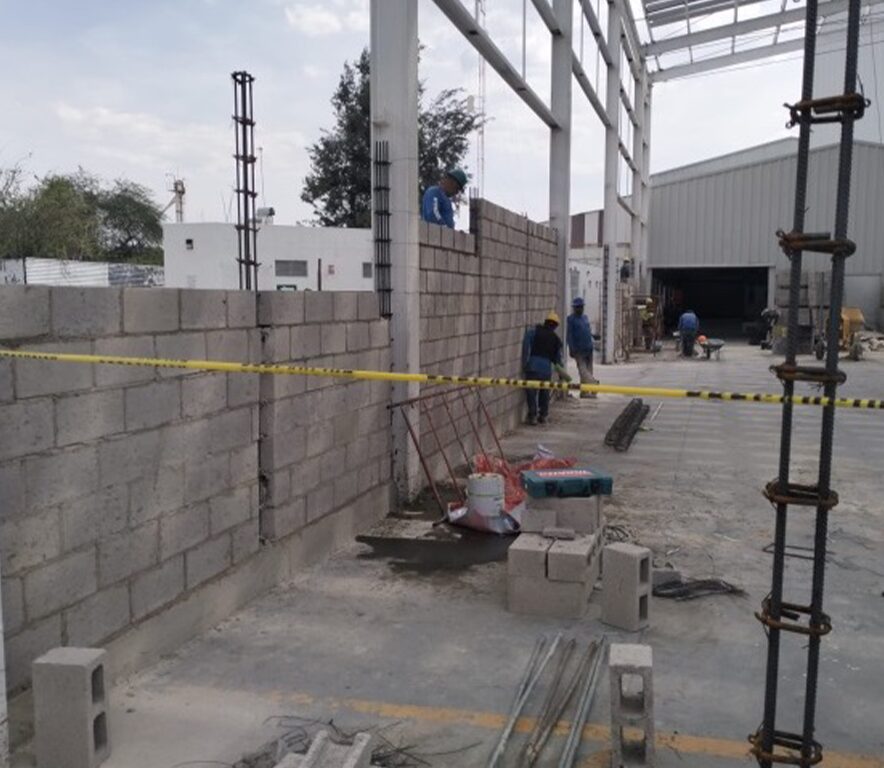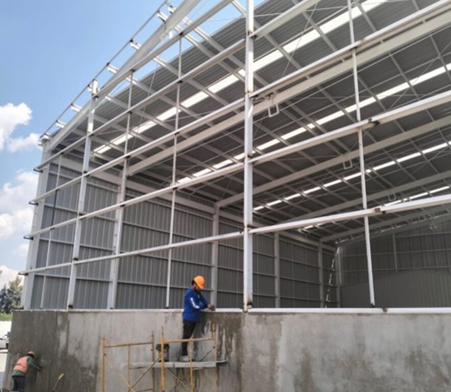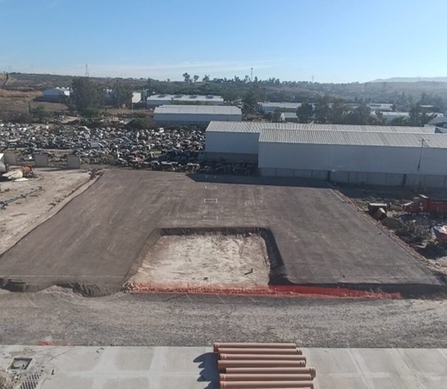 El alcance incluyó trabajos de terracerías y nivelación del terreno, diseño y ejecución de cimentaciones profundas y superficiales, colado de losa de piso industrial de alta resistencia, así como la construcción de muros perimetrales y estructuras metálicas para soporte de cubierta.