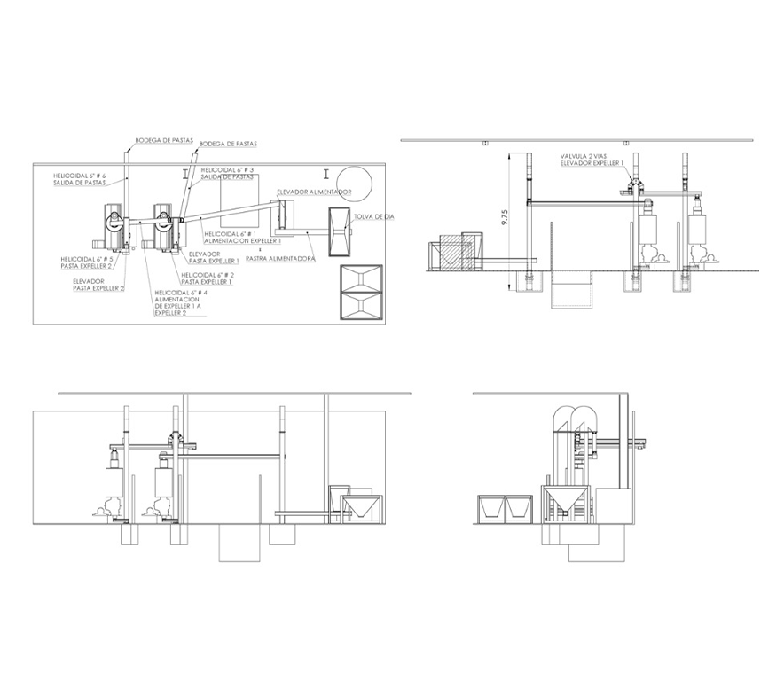 Diseño, cálculo, fabricación y montaje de transportadores tipo rastra, transportadores helicoidales, elevadores de cangliones, válvulas de 2 vías y válvulas de cuchillas, soporteria y plataformas proceso de extracción de aceite.